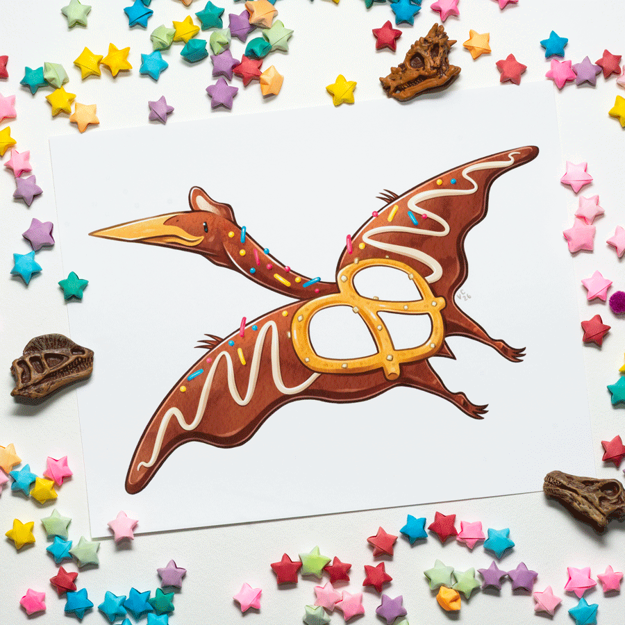 Fine art print of my Dessert Dino illustration "Chocolate Pretzelcoatlus" ♡ Illustrated in 2026.