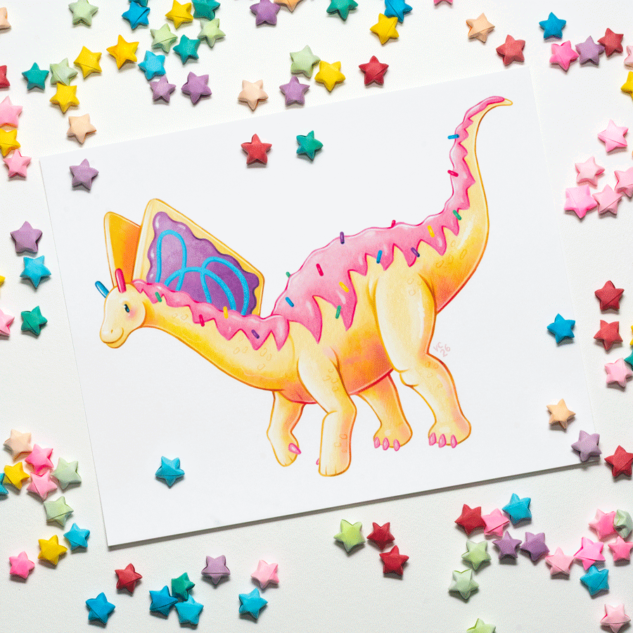 Fine art print of my Dessert Dino illustration "Stomp Tart" ♡ Illustrated in 2026.