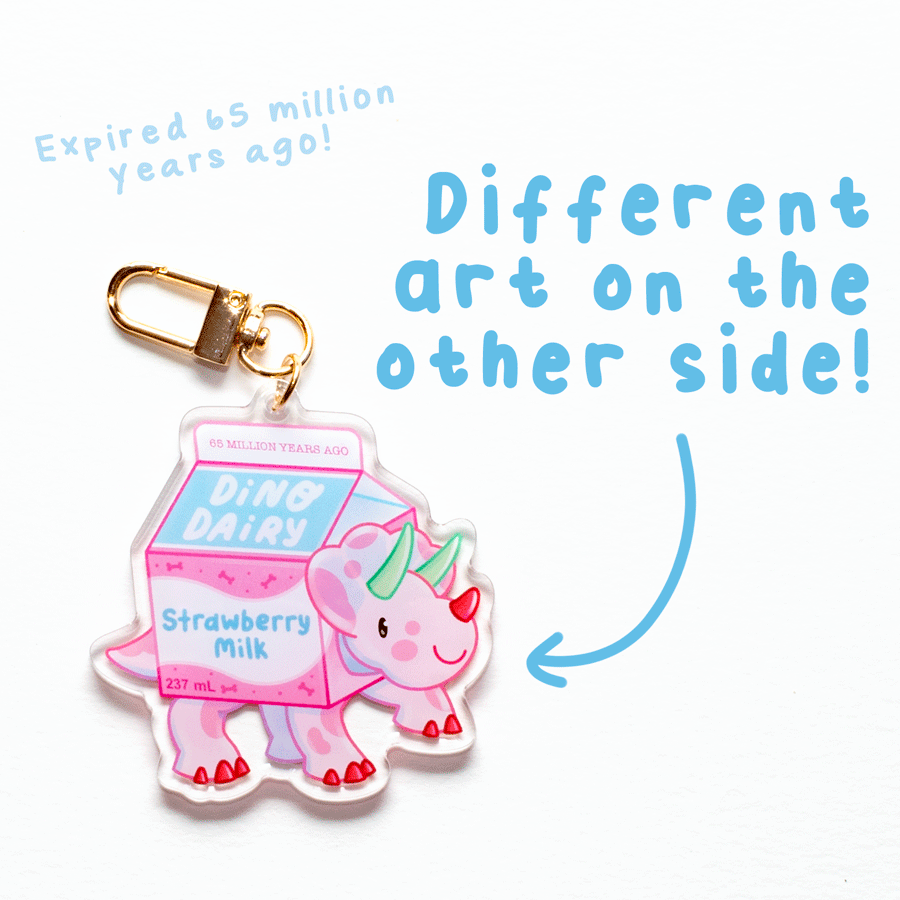 This Baby Dessert Dino keychain featuring Strawberry Milk Trike is the perfect addition to your keys, backpack, or purse! The double-sided acrylic charm has a layer of epoxy on the front for extra gloss and durability.